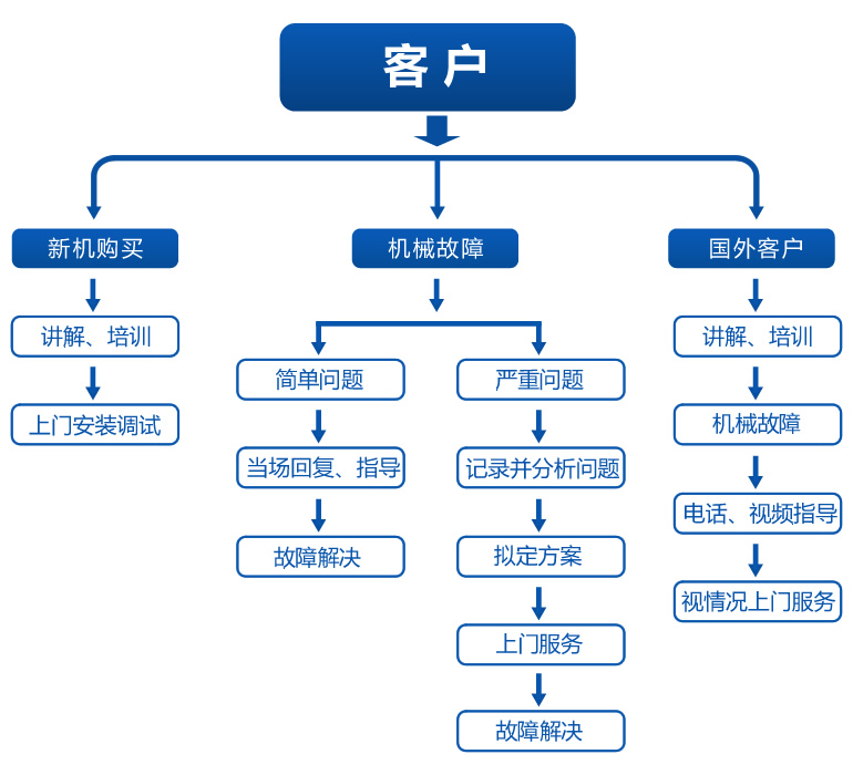 我們嚴(yán)格執(zhí)行《售后服務(wù)承諾書》,我們深信優(yōu)質(zhì)、系統(tǒng)、全面、快捷的服務(wù)是事業(yè)發(fā)展的基礎(chǔ)。 經(jīng)過多年的不斷探索和進(jìn)取,我們形成了"以客戶為核心、以質(zhì)量為企業(yè)的第一生命"的服務(wù)理念。 并以嚴(yán)格的管理、先進(jìn)的技術(shù)創(chuàng)建國(guó)內(nèi)一流的服務(wù)企業(yè)為目標(biāo),制定了"規(guī)范管理制度,嚴(yán)格過程控制,保證產(chǎn)品質(zhì)量,達(dá)到顧客滿意"的質(zhì)量方針,堅(jiān)持"用戶第一"的原則,構(gòu)建良好的銷售服務(wù)體系,為客戶提供優(yōu)質(zhì)的售前、售中及售后服務(wù)。 服務(wù)宗旨:快速、果斷、準(zhǔn)確、周到、徹底 服務(wù)目標(biāo):服務(wù)質(zhì)量贏得用戶滿意 服務(wù)效率:保修期內(nèi)或保修期外如設(shè)備出現(xiàn)故障,供方在接到通知后,維修人員在24小時(shí)內(nèi)可達(dá)到現(xiàn)場(chǎng)并開始維修。 服務(wù)原則:產(chǎn)品保修期為12個(gè)月,在保修期內(nèi)供方將免費(fèi)維修和更換屬質(zhì)量原因造成的零部件損壞保修期外零部件的損壞,提供的配件只收成本費(fèi),由需方人為因素造成的設(shè)備損壞,供方維修或提供的配件均按成本價(jià)計(jì)。 在安裝后機(jī)器能正常的運(yùn)行起來,我公司技術(shù)人員將對(duì)機(jī)器進(jìn)行性能優(yōu)化和穩(wěn)定性方面的調(diào)試以確定機(jī)器的質(zhì)量是否能達(dá)到用戶的要求和需要。在調(diào)試時(shí)我公司技術(shù)人員必須耐心的向用戶解釋和指導(dǎo),確保用戶能基本理解機(jī)器正常運(yùn)行的操作知識(shí)及對(duì)機(jī)器穩(wěn)定運(yùn)行的基本調(diào)試。